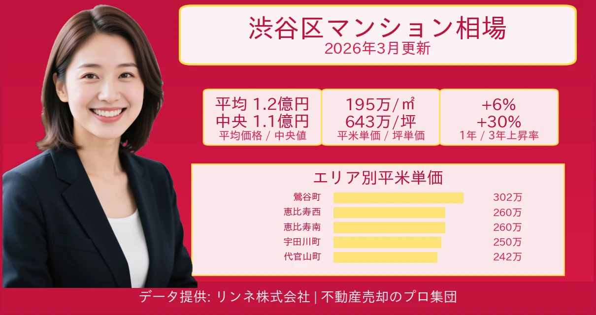 2026年現在、渋谷区の不動産市況は引き続き売り手優位の状況が続いています。平米単価は2020年から約70%上昇し、2026年は195万円/㎡(坪単価645万円)に達しており、歴史的な高値圏にあります。